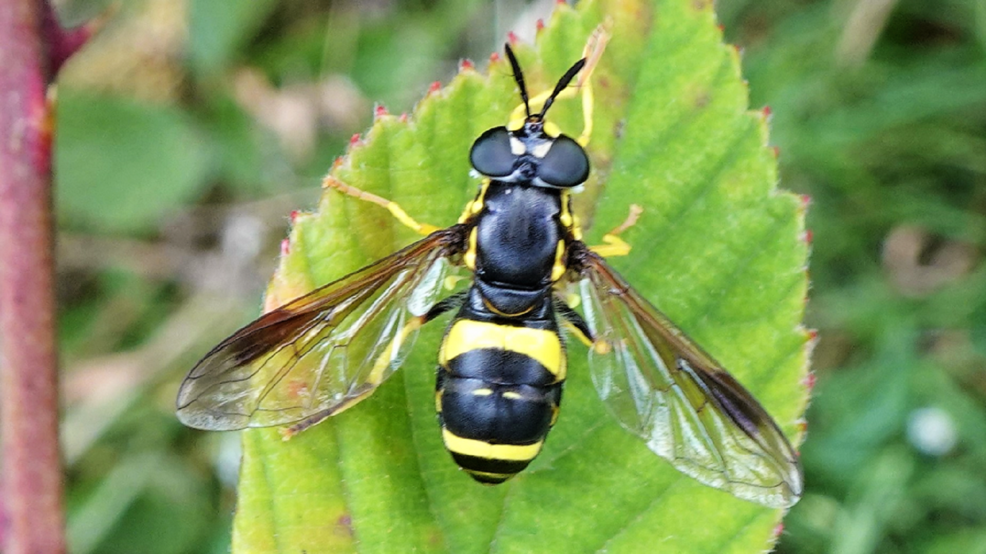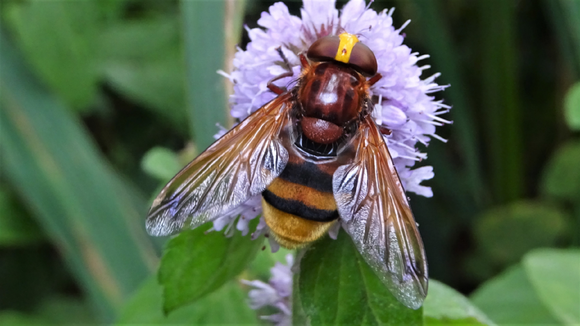 The Thick-headed Fly has a brown body and large yellow head with big brown eyes. It is seen from May until September when it is often found resting on hedgerows with the abdomen folded forward. It feeds on nectar and pollen.