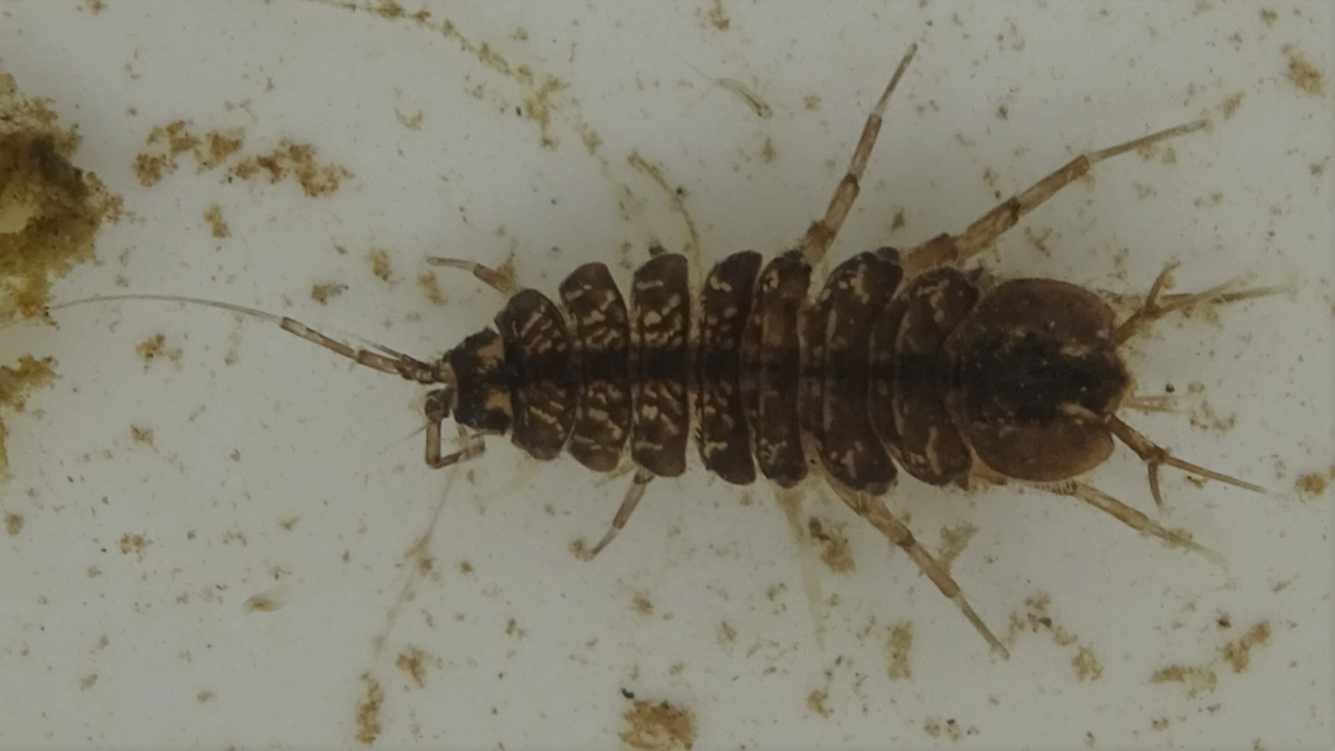 This crustacean is related to woodlice but resides completely in aquatic environments. It has two pale spots on its head. While it does not swim well, but tends to crawl among vegetation and mud. It is common in stagnant water due to its ability to tolerate low oxygen levels and can be encountered throughout the year.