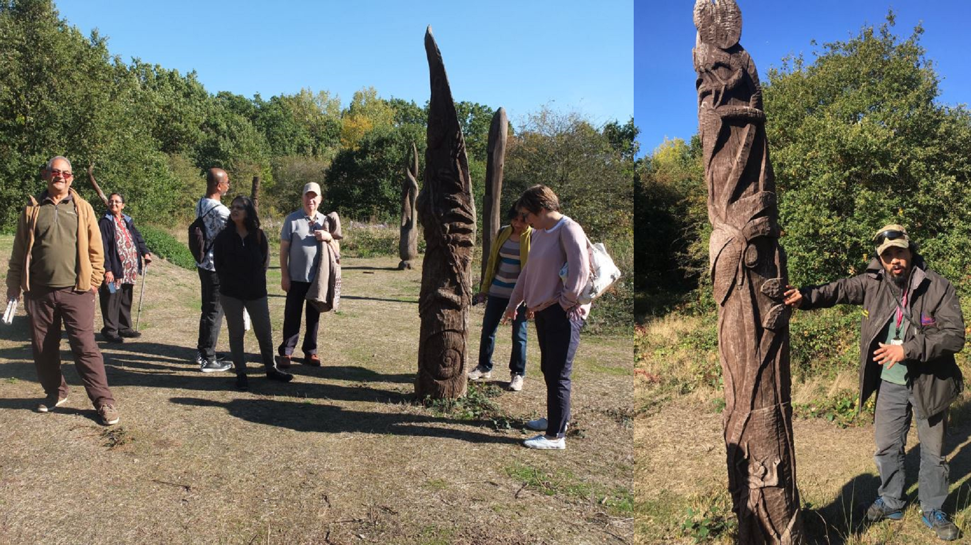 Redbridge Vision organised a nature walk led by Francis Castro (right) during October. The group gathered at Woodhenge, part of a nature trail that officially opened in 2005. It was designed by sculptor Jeff Higley and planned in collaboration with Country Park manager Paul Browne. Woodhenge serves as the centrepiece of the trail featuring twelve sculptures that represent the life cycles of creatures found in the forest. At conception it was envisioned that the large wooden circle would function as an outdoor classroom and a meeting point. The sculptures were made from oak trees that were removed during the re-creation of a wood pasture area.