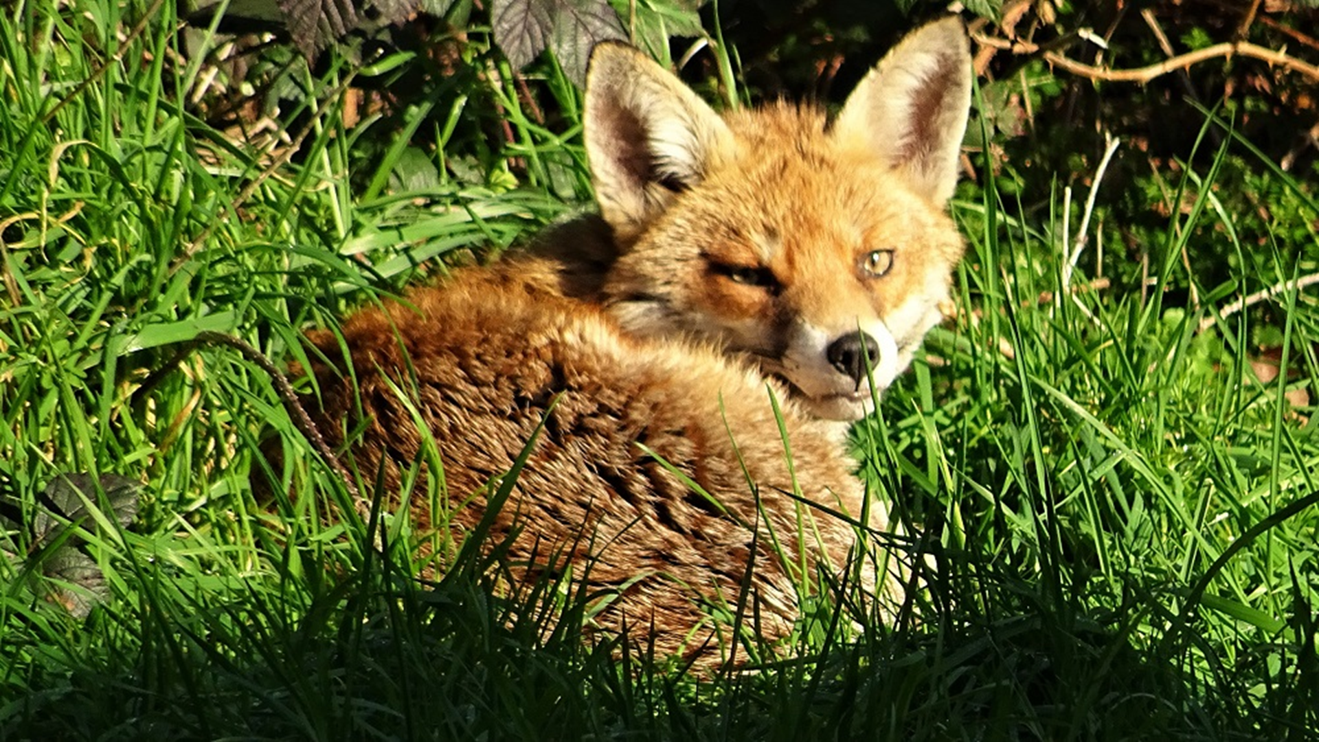This picture shows a fox is resting in the sun. Males are referred to as dogs or reynards, while females are called vixens, and their young are known as cubs. A collection of foxes is called an earth or skulk.